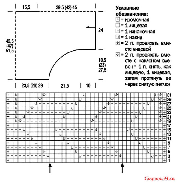 Начать с петель перед правой стрелкой, раппорт между стрелками постоянно повторять и закончить петлями после левой стрелки.