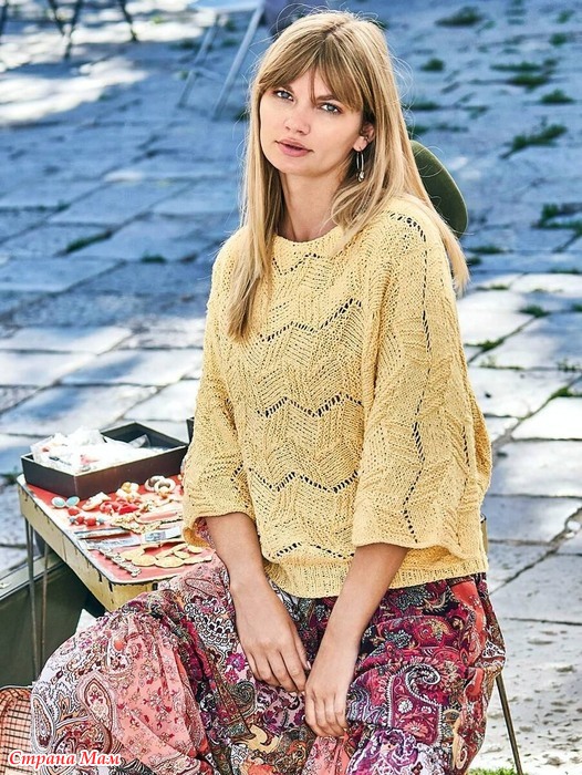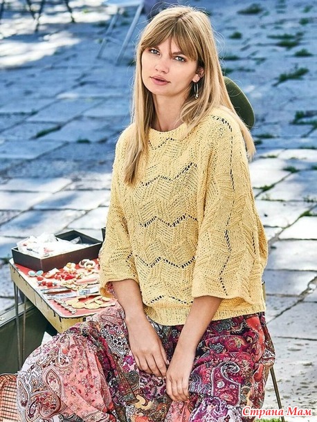Несмотря на фактурную вязку, пуловер выглядит лёгким и воздушным! Такой эффект достигается во многом благодаря хлопковой нити, имеющей полую структуру. Такая вещь одинаково хорошо будет смотреться как с узкими джинсами и брюками, так и с пышными юбками или юбками-карандаш.