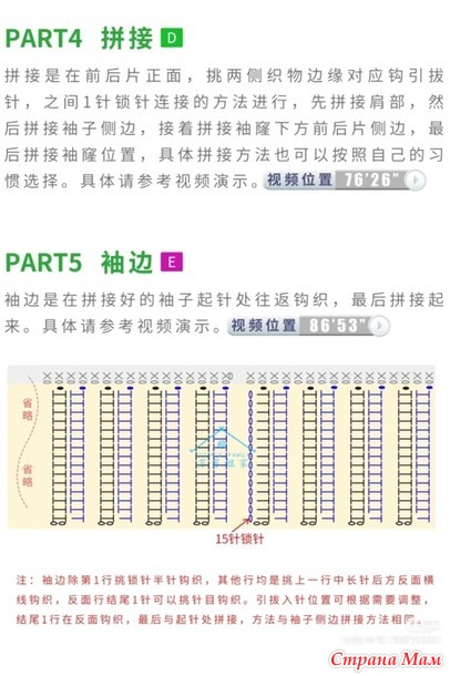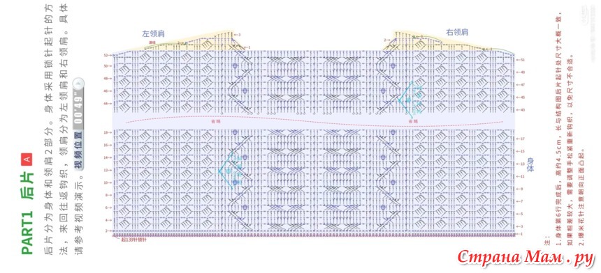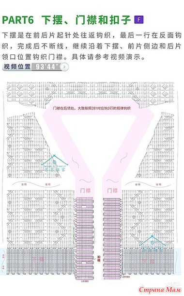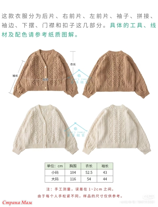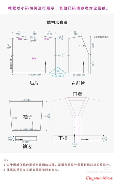 Этот предмет одежды состоит из нескольких частей: спинки, правой передней полочки, левой передней полочки, рукавов, вставок, манжет, подола, планки и пуговиц. Информация о конкретных инструментах, нитках и цветовых схемах представлена ​​на выкройке.