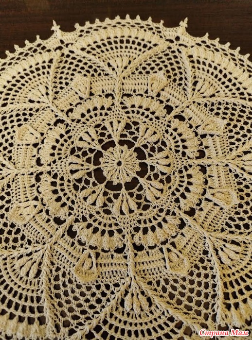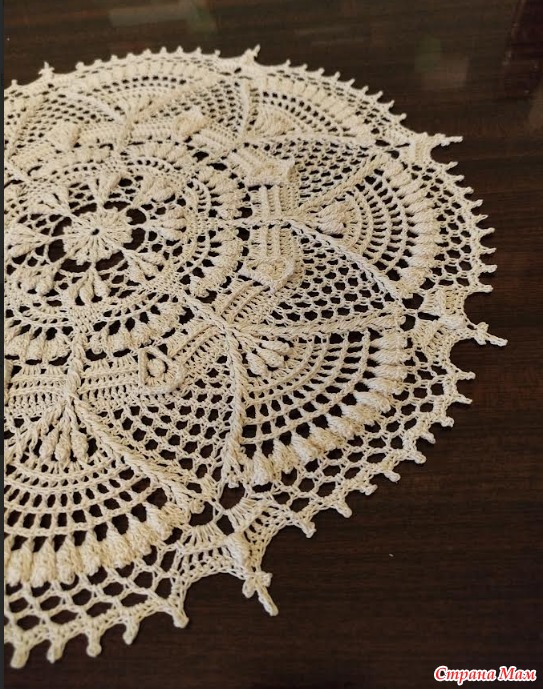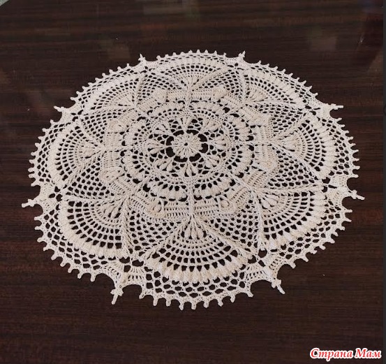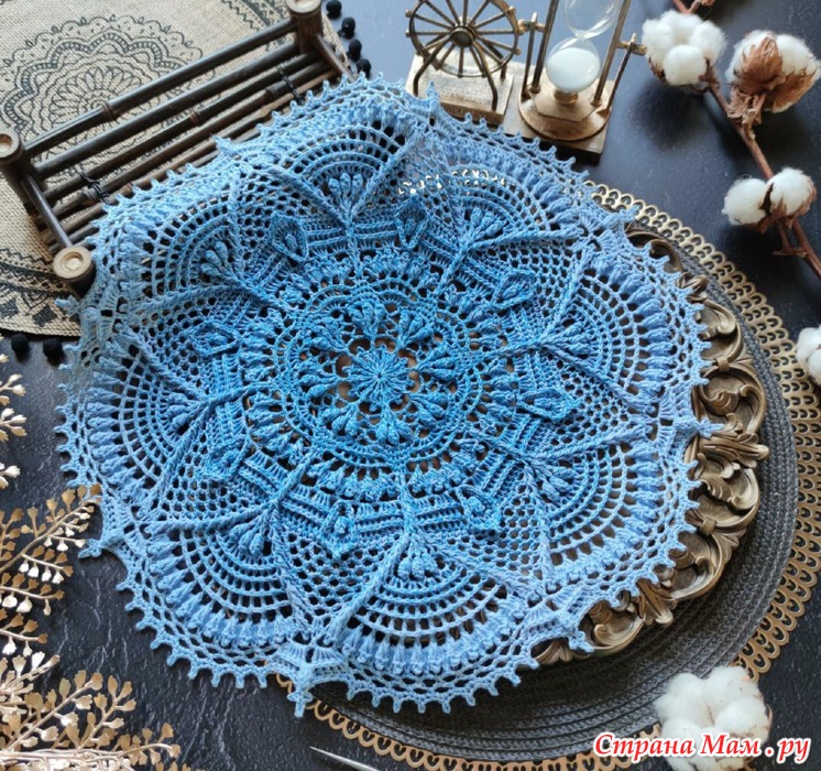 Эту салфетку с МК я нашла в инете и мне понравились некоторые элементы, которые я еще не вязала. МК хороший и вязалась салфетка с удовольствием. Нитки Ярнарт виолет, 282м/50гр, крючок 1,5, диаметр получился 43см.