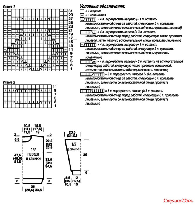 Внимание. Первые 2 (3) 4 прибавления провязывать изнаночной гладью, из следующих 12 прибавок образовать узор «Коса» С и оставшиеся 2 (3) 4 прибавления провязывать изнаночной гладью.