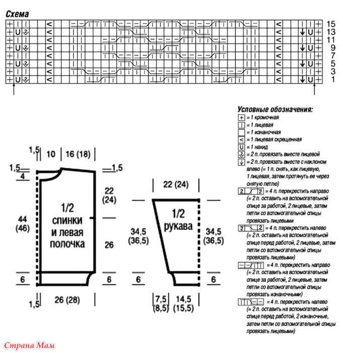 Продолжить работу на спицах № 3,5 узором 2, при этом для 2-го размера после кромочной начать с последних 7 п. раппорта, выполнить 4 х 38 п. раппорта между стрелками и закончить первыми 7 п. раппорта и 1 кромочной.
