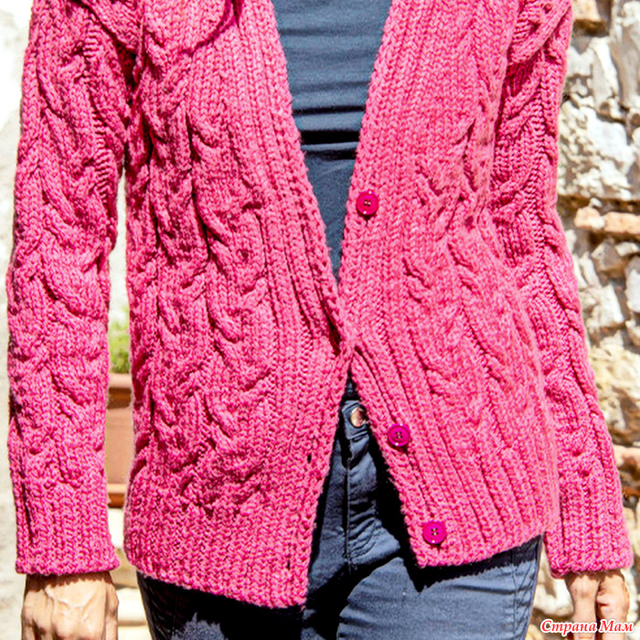Плотность вязания: 15,5 п. х 19 р. = 10 х 10 см, связано узором из «кос» на спицах № 7.