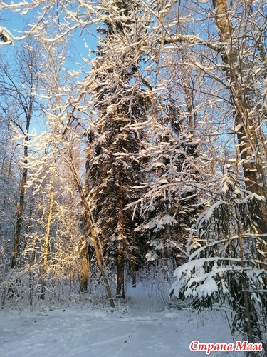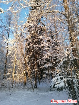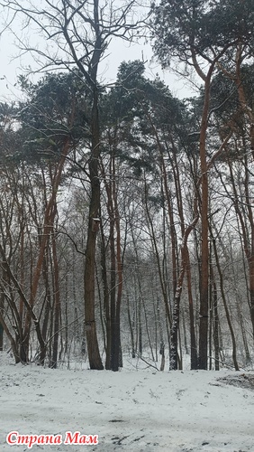 Снега вообще то мало, чуть земля присыпана, но на ветках деревьев его полно.