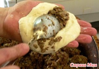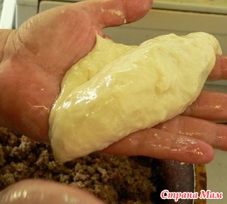 Выкладываем на ладонь кусочек теста, расплющиваем в лепешку.