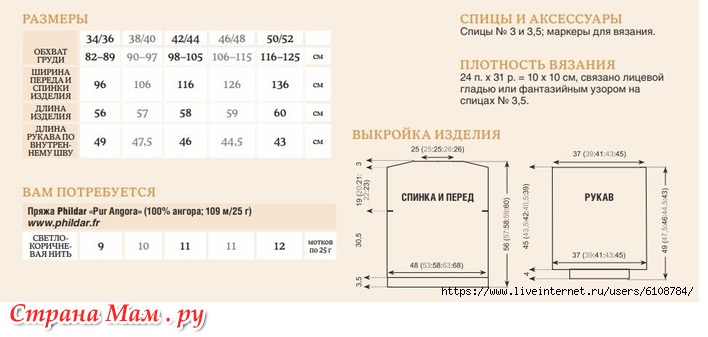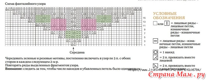Через 39 (36,5:34,5:32,5:30) см от начального ряда продолжить вязать лицевой гладью и фантазийным узором (см. схему), распределив петли таким образом, чтобы совпали середина схемы и середина работы (см. схему, если петли по краям работы невозможно вязать по узору, следует вязать их изнаночной гладью).