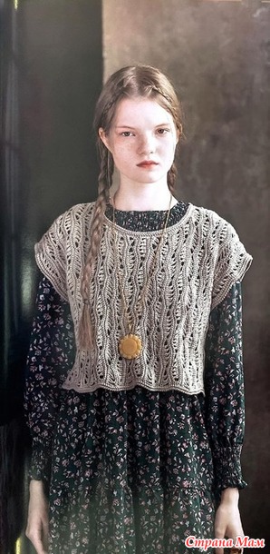 Уникальный волнообразный узор – творение горизонтальной вязки. Укороченный жилет, позволяющий насладиться лёгкостью, которую может обеспечить только вязание крючком, идеально сочетается с объёмными верхом и низом.