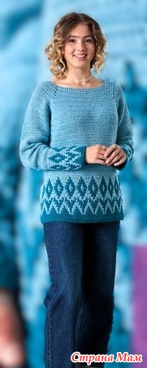Набрать 1 воздушную петлю, соединить 1 соединительным столбиком, чтобы сформировать круг. Переход круга находится на линии реглана на спинке и правом рукаве. Вязать по схеме, распределяя петли следующим образом: 28 столбиков с накидом на спинке, 12 столбиков с накидом на левом рукаве, 28 столбиков с накидом на переде и 12 столбиков с накидом на правом рукаве. Вязать 17 (18) 19 (20) рядов основным узором по схеме. В первом ряду вязать 1 воздушную петлю для прибавки; она не засчитывается. Затем прибавлять 4 столбика с накидом 10 (13) 16 (19) раз по линиям реглана. Для этого вязать ряды 1-3 по схеме и повторять ряд 3 еще 8 (11) 14 (17) раз. Для оставшихся прибавок реглана прибавьте по 2 столбика с накидом 6 (4) 2 (0) раз по линиям реглана. Для этого, согласно инструкции к выкройке, провяжите всего 6 (4) 2 (0) столбиков в 4-м ряду. Теперь у вас 80 (88) 96 (104) столбиков с накидом на спинке, 64 (68) 72 (76) столбиков с накидом на левом рукаве, 80 (88) 96 (104) столбиков с накидом на переде и 64 (68) 72 (76) столбиков с накидом на правом рукаве. Для лучшей посадки на спинке провяжите 2 ряда основным узором на 80 (88) 96 (104) столбиках с накидом. Для нижней части провяжите все петли переда и спинки по кругу = 160 (176) 192 (208) п. Начало круга — с левой стороны. Далее провяжите 15 рядов основным узором. Далее — согласно инструкции к узору.