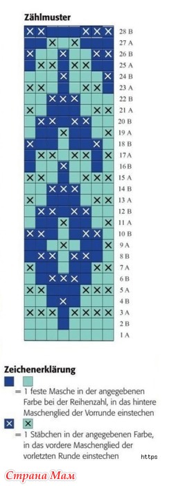 Вяжите крючком ряды 1-28 мозаичным узором, чередуя 1 ряд цветом и 1 ряд цветом B. Наконец, провяжите еще 3 ряда нитью петроза.