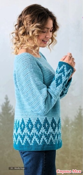 Для рукавов провяжите 2 дополнительных ряда на спинке 4 столбиками с накидом и соедините 64 (68) 72 (76) столбиков на рукаве, чтобы сформировать круг. Продолжайте вязать основным узором цветом А 68 (72) 76 (80) столбиков. Затем провяжите 27 см основным узором по кругу. Для формирования рукава убавьте по 2 столбика 10 (8) 12 (10) раз в каждом 2-м ряду и 4 (8) 0 (4) раз в каждом ряду. Для этого провяжите по 2 столбика с накидом вместе в начале и в конце каждого ряда - 40 (40) 48 (48) столбиков. Затем провяжите ряды 1-28 мозаичным узором согласно схеме, чередуя 1 ряд цветом А и 1 ряд цветом В. Наконец, провяжите 1 ряд столбиков с накидом петролейным узором.