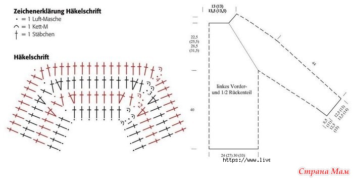 Набрать 1 воздушную петлю, соединить 1 соединительным столбиком, чтобы сформировать круг. Переход круга находится на линии реглана на спинке и правом рукаве. Вязать по схеме, распределяя петли следующим образом: 28 столбиков с накидом на спинке, 12 столбиков с накидом на левом рукаве, 28 столбиков с накидом на переде и 12 столбиков с накидом на правом рукаве. Вязать 17 (18) 19 (20) рядов основным узором по схеме. В первом ряду вязать 1 воздушную петлю для прибавки; она не засчитывается. Затем прибавлять 4 столбика с накидом 10 (13) 16 (19) раз по линиям реглана. Для этого вязать ряды 1-3 по схеме и повторять ряд 3 еще 8 (11) 14 (17) раз. Для оставшихся прибавок реглана прибавьте по 2 столбика с накидом 6 (4) 2 (0) раз по линиям реглана. Для этого, согласно инструкции к выкройке, провяжите всего 6 (4) 2 (0) столбиков в 4-м ряду. Теперь у вас 80 (88) 96 (104) столбиков с накидом на спинке, 64 (68) 72 (76) столбиков с накидом на левом рукаве, 80 (88) 96 (104) столбиков с накидом на переде и 64 (68) 72 (76) столбиков с накидом на правом рукаве. Для лучшей посадки на спинке провяжите 2 ряда основным узором на 80 (88) 96 (104) столбиках с накидом. Для нижней части провяжите все петли переда и спинки по кругу = 160 (176) 192 (208) п. Начало круга — с левой стороны. Далее провяжите 15 рядов основным узором. Далее — согласно инструкции к узору.