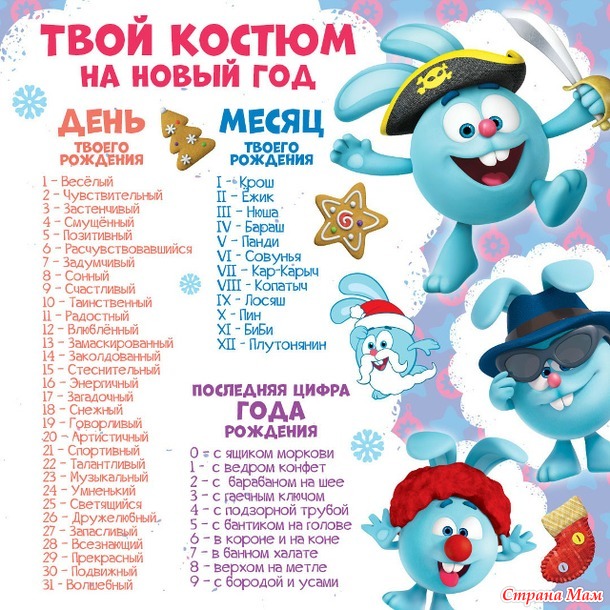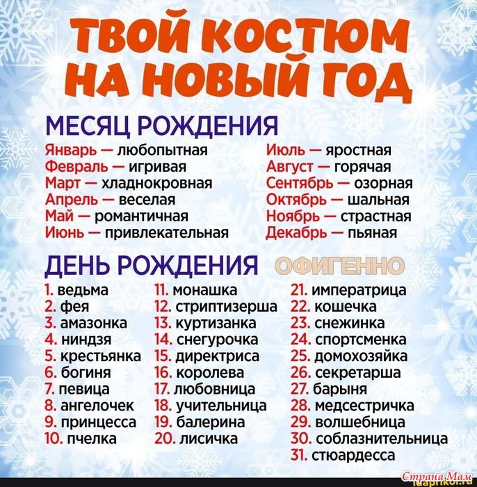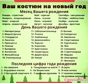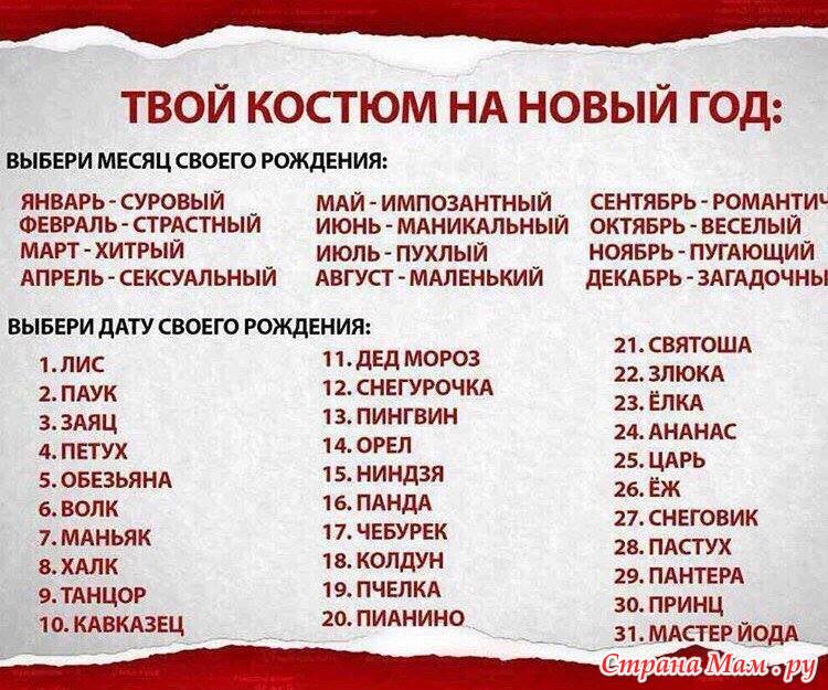 Каждый год, под новый год ... ходят по инету юмористические списки сборного новогоднего костюма под цифрами дат рождения.