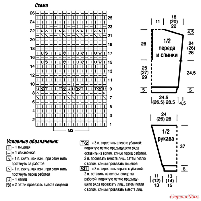 Одновременно для скосов рукава в каждом 8-м р. от нижней планки с обеих сторон прибавить по узору 5 х 1 п., затем в каждом 6-м р. 17 х 1 п. (в каждом 6-м р. 24 х 1 п.) в каждом 6-м р. 20 х 1 п. и в каждом 4-м р. 6 х 1 п. = 96 (104) 112 п.