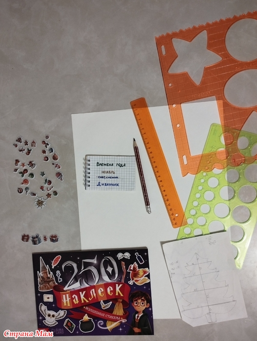 Материалы использовала "подручные" - лист А3, трафаретные линейки, карандаш, гуашь и наборы наклеек.