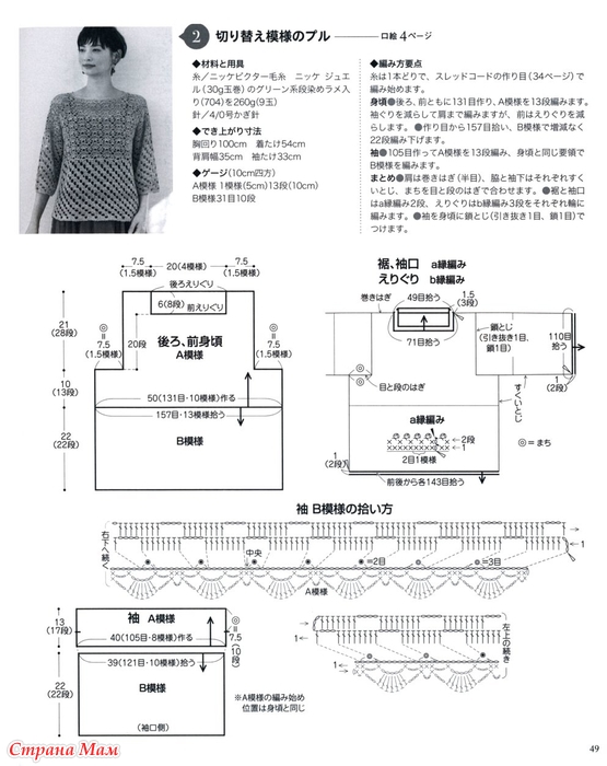 Краткое описание: ● Сшейте полу столбики на плечах, аккуратно сшейте боковые стороны и подмышки, соедините ластовицу стежками и рядами. ● Выполните два ряда кромочных швов А на подгибе и манжетах и ​​три ряда кромочных швов В на воротнике, каждый по кругу. ● Пришейте рукава к туловищу цепным стежком (1 соединительный столбик, 1 цепной столбик).