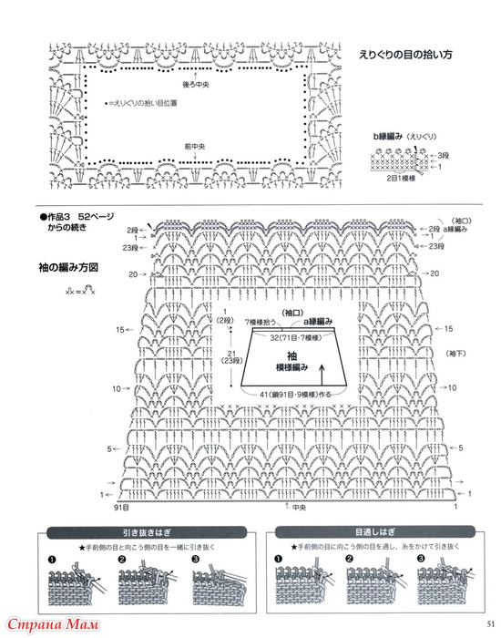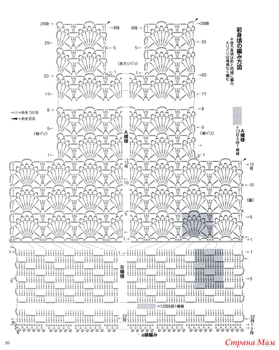 Убавить пройму и вязать до плеча, но убавить воротник спереди. ●От набора петель набрать 157 петель и вязать 22 ряда узором B без прибавлений и убавлений.