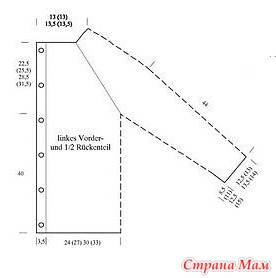 Разделение: 47 (51) 57 (61) п. на левой полочке, 1 воздушная петля, 83 (91) 99 (107) п. на левом рукаве, 1 воздушная петля, 95 (103) 113 (121) п. на спинке, 1 воздушная петля, 83 (91) 99 (107) п. на правом рукаве, 1 воздушная петля, 47 (51) 57 (61) п. на правой полочке.