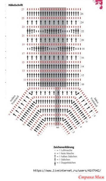 Основной узор: Вяжите по схеме. В верхней части наберите нечётное количество петель. В нижней части количество петель...