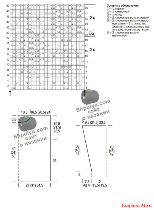 Через 54,5 см = 138 р. (56,5 см = 144 р.) 58,5 см = 150 р. от начального ряда закрыть оставшиеся 31 (38) 45 п. Вторую сторону закончить симметрично.
