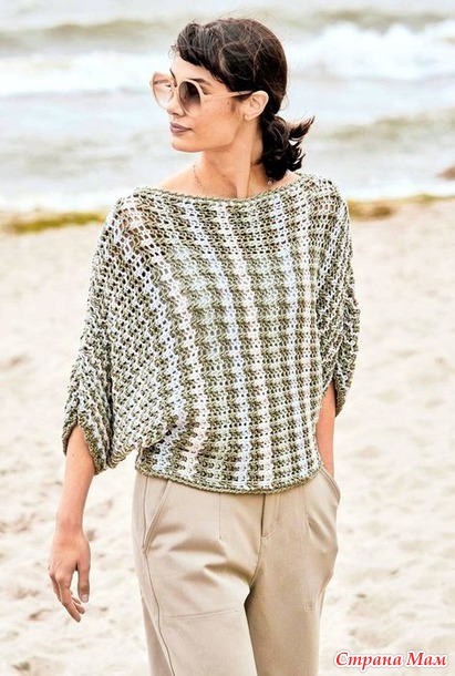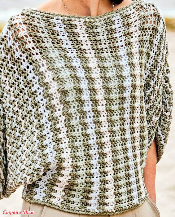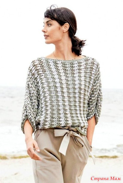 Поперечный серебристо-бело-зелёный пуловер со сквозным узором. Спицы.