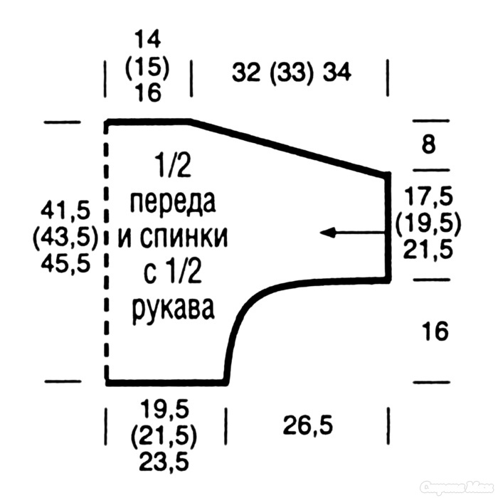 Внимание: перед и спинку вязать поперек от рукава до рукава, начиная с правого рукава. Стрелка на выкройке = направление вязания.