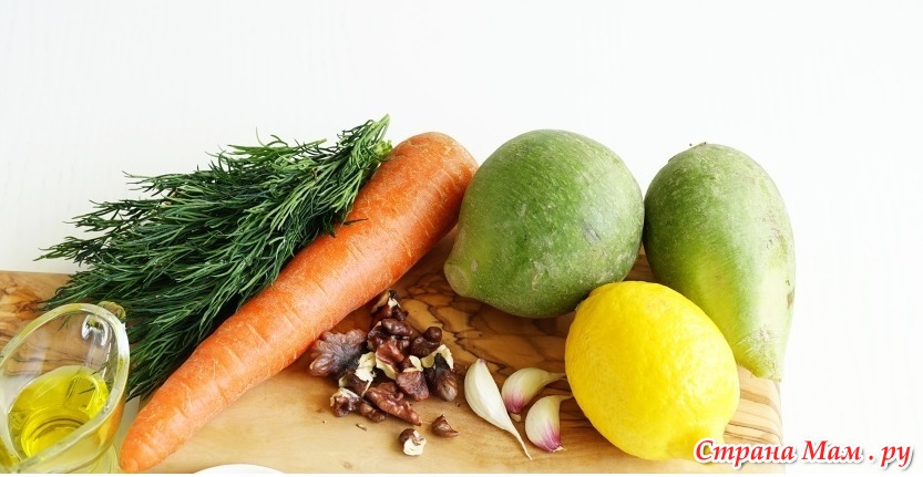 Подготовить все ингредиенты для приготовления салата из зелёной редьки.