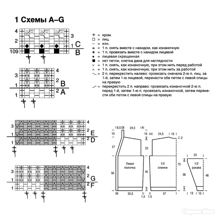 Резинка F и полупатентный узор G (правая часть переда). Вязать по схеме F/G, как резинку А и полупатентный узор В для спинки, при этом по правому краю вязать на 10 п. планку со снятыми петлями, обозначенную на схеме между двумя двойными стрелками на сером фоне.