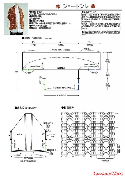 Часть тела... Приготовьте одну цепочку (144 петли). Как сделать цепочку! Сделайте петлю и вяжите узорчатой ​​вязкой. Смотрите схему вязания. Прибавьте петли по пройме и по бокам, затем лицевой нитью, продолжая подшивать. Вяжите по схеме A.