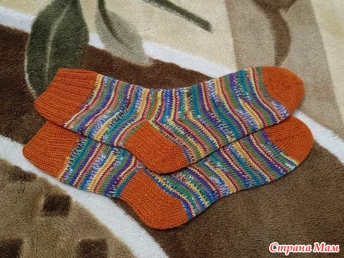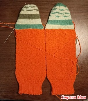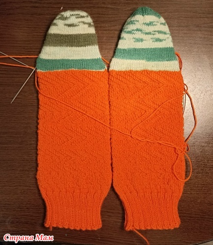 На этой неделе уже достала оранжевые носки, довязала пятку, набрала петли по боковым стенкам и начинаю стопу вязать. Как ни силилась размотать пряжу на одинаковые мотки и с одного места узора начать - нишиша! Как люди это делают?
