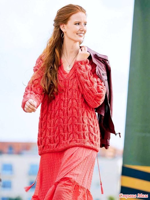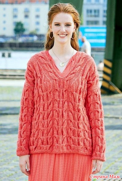 Для вязания нам потребуется 700 (800) г розово-оранжевой меланжевой (цвет № 23) пряжи LANA GROSSA "Fusione": 30% хлопок, 26% натуральная шерсть, 25% шерсть альпака, 19% полиамид; 140 м/50 г.