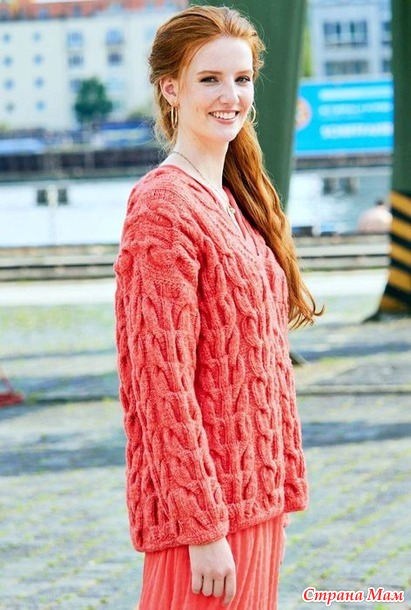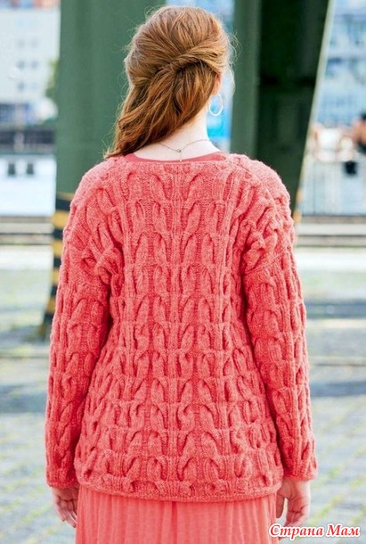 Теплый пуловер с крупными косами. Спицы.