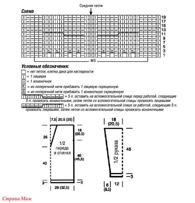 Узор 2: узор из «кос» (число петель вначале кратно 19 + 6 (1) + 2 кромочные) — вязать согл. схеме. На ней даны лицевые ряды.