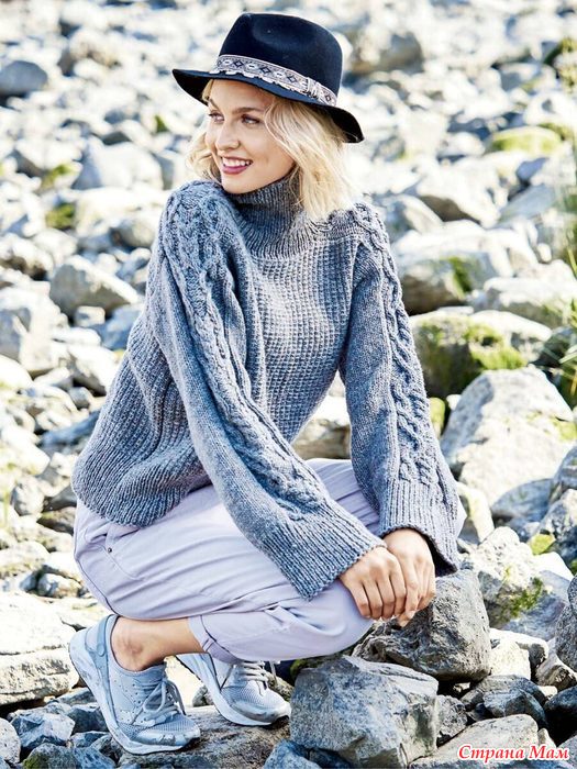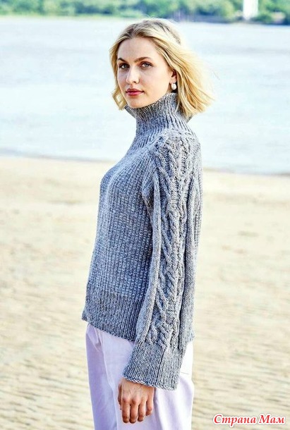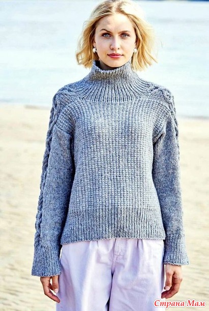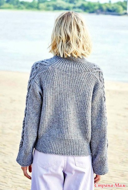 Серо-голубой свитер с аранами и структурным «тканым» узором. Спицы.
