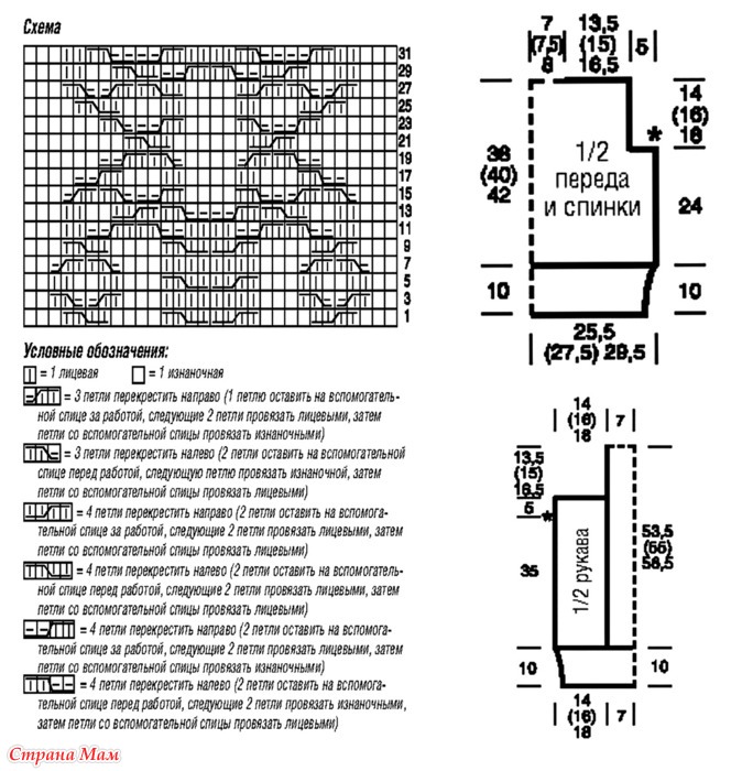 Узор 4: узор из «кос» (на 30 петель) = вязать согл. схеме.
