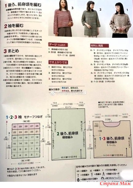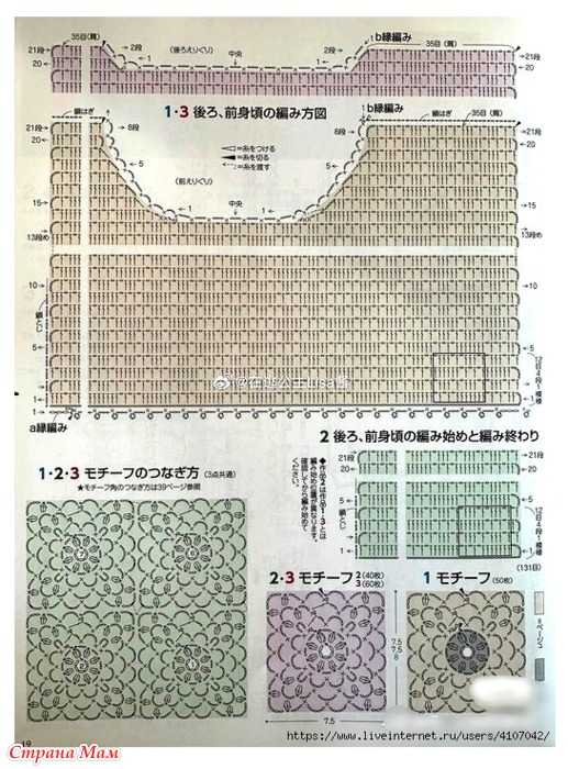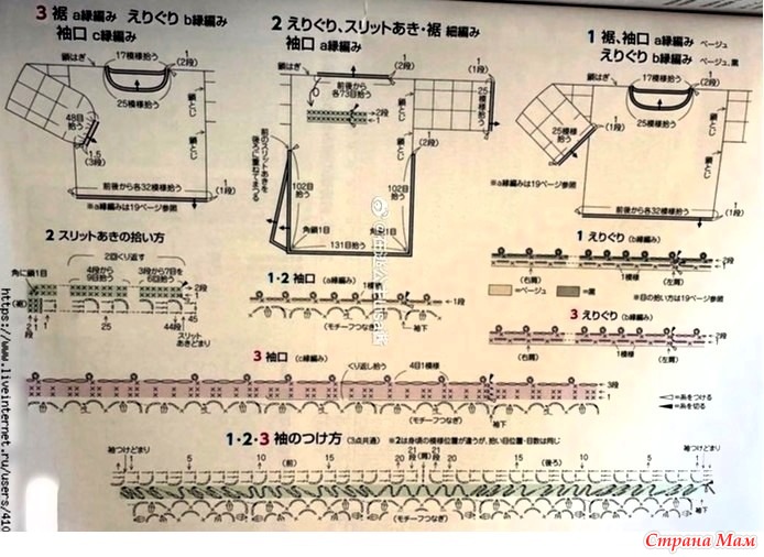Задняя и передняя части деталей 1–3 показаны одновременно, но количество петель и рядов одинаково для обеих деталей.