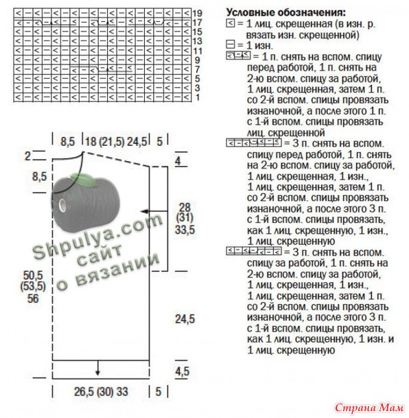 Изн. р.: вязать согласно узору до последних 5 или 6 п., затем 2 или 3 п. провязать вместе изнаночной скрещенной, 2 изн., кромочная.