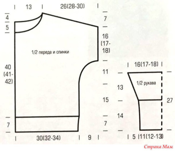 Левая половинка переда: вязать, как правую половину спинки, но с более глубоким вырезом горловины. Для этого через 14 (15-16) см = 40 (42-44) р. от начала проймы закрыть с левой стороны 7 п., затем в каждом 2-м р. 1 х 4 п., 1 х 3 п., 2 х 2 п. и 6 х 1 п.