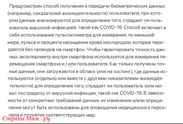 А метод включает в себя не столько упомянутые «тесты на ковид», сколько передачу и хранение различных биометрических данных, в перечень которых в патент от 2020го года были включены данные с пульсоксиметра (пульс и оксигенация) с передачей на смартфон и опцией оповещения медперсонала.