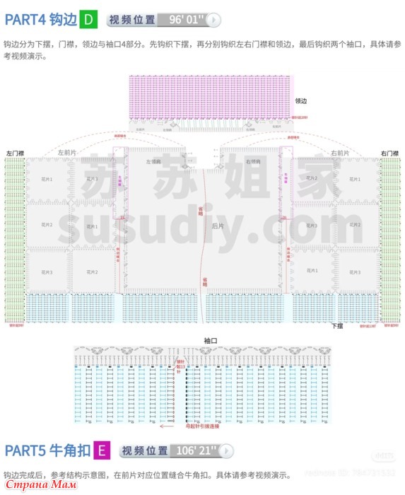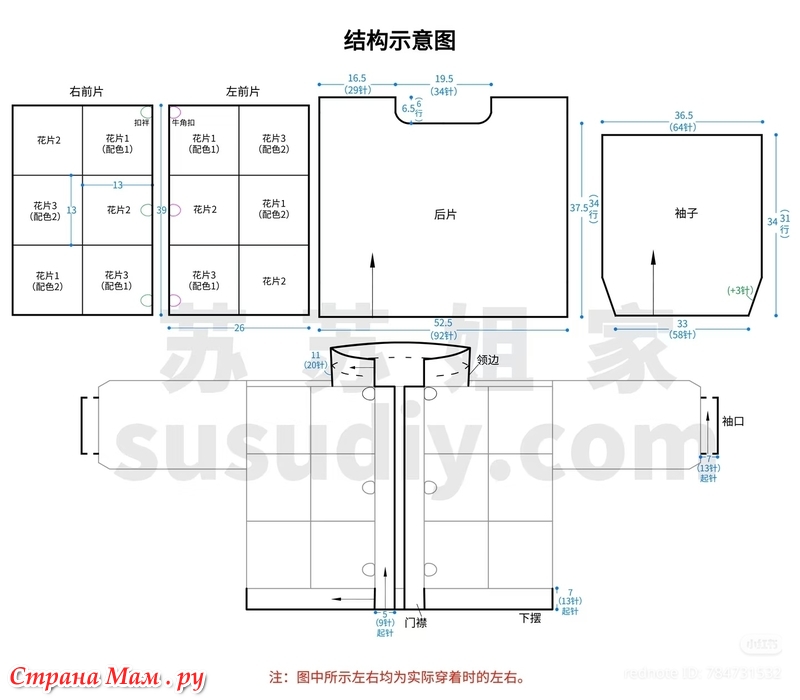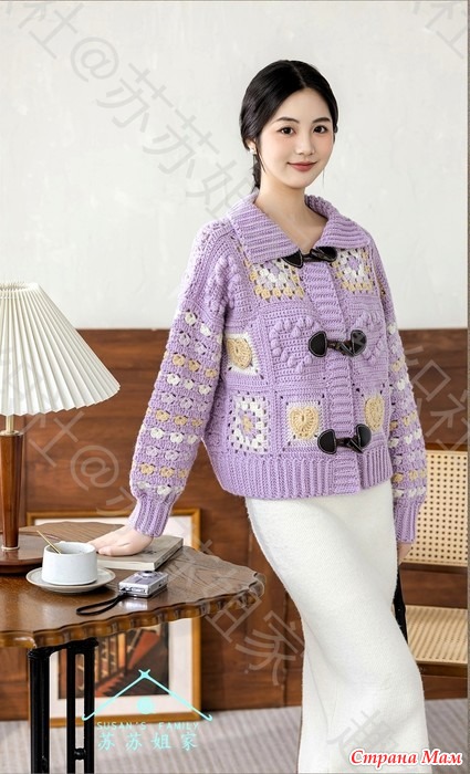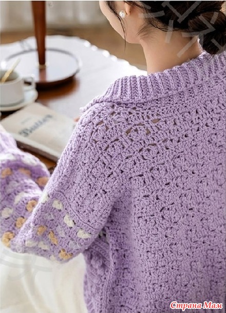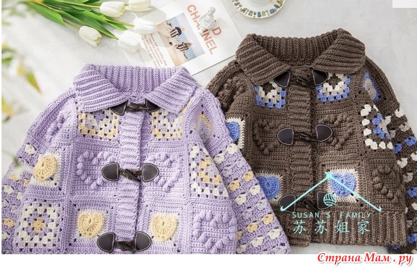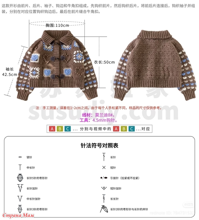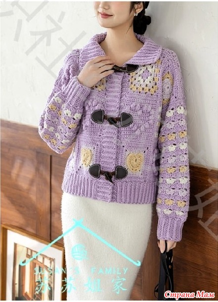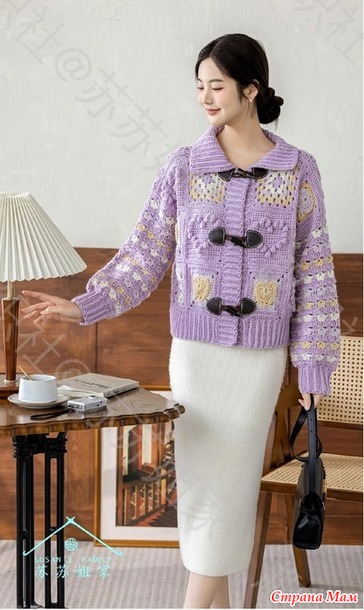Эта куртка состоит из переда, спинки, рукавов, обвязанного крючком края и пуговиц. Сначала вяжите переднюю часть, затем спинку. После соединения переда и спинки вяжите и собирайте рукава. Обвяжите крючком края в соответствующих местах и, наконец, пришейте пуговиц к передней части.