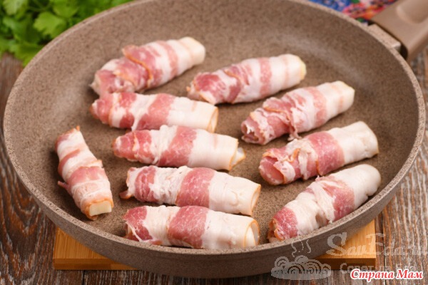 Сыр заворачиваем в бекон, получается 20 заготовок. Нагреваем сковороду без масла, выкладываем закуску по 10 штук швом вниз. Жарим на среднем огне до румяной корочки с 2 сторон (уходит около 10 минут).