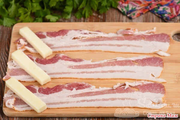 Готовлю закуску из сыра для гриля Artis, можно заменить на сыр Халлуми. Нарезаем сыр (250 г) на брусочки (20 шт.). Брусочки сыра выкладываем на полоски бекона (20 шт.). Бекон можно использовать сырой или сырокопченый, как у меня.