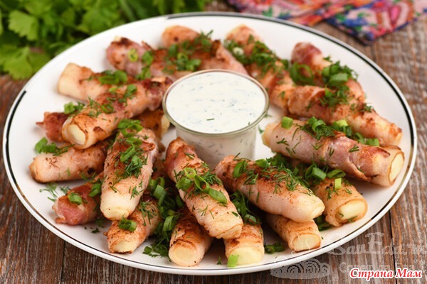 Сыр внутри становится мягким, но не вытекает наружу. Аромат потрясающий. Сыр в беконе выкладываем на тарелку, дополняем соусом, зеленью и сразу подаем на стол. Бекон дает приятный копченый вкус, а сыр сливочный вкус. Это очень вкусная закуска!