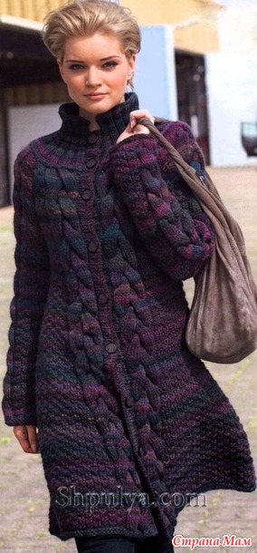 Меланжевое пальто реглан с крупными косами. Спицы.
