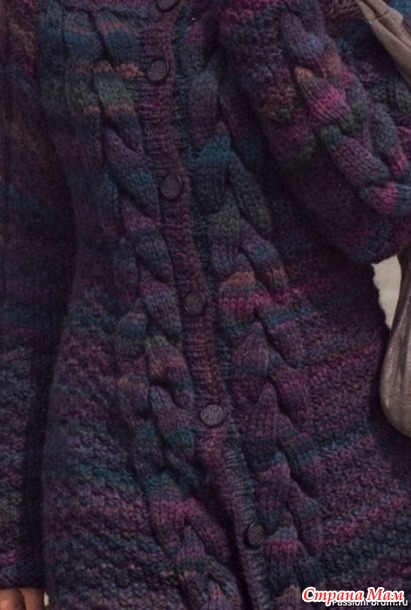 Размеры: 38/40 (44) 48/50. Вам потребуется: 900 (950) 1000 г черничной меланжевой пряжи riga (53% овечьей шерсти, 47% полиакрила, 80 м/50 г); прямые спицы № 8; круговые спицы № 6; 9 пуговиц.