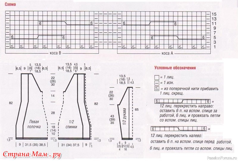 Правый рукав: вязать, как левый рукав, но с косой В.