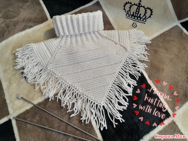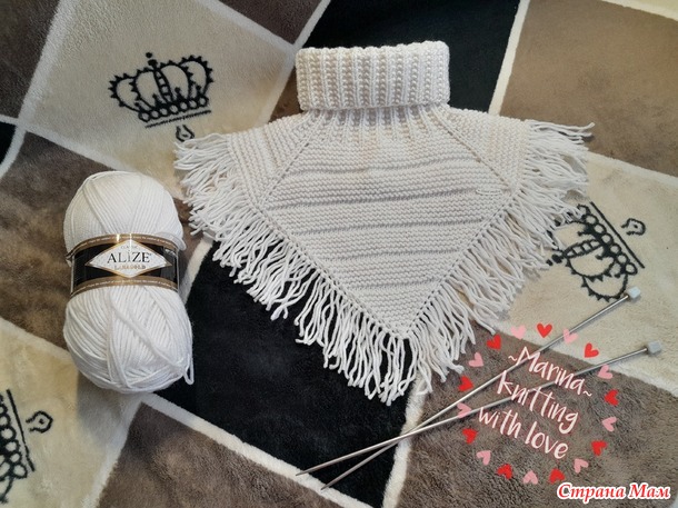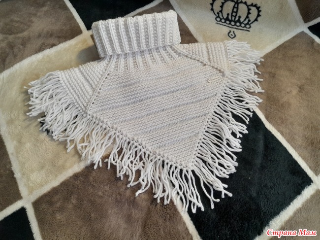 Вяжите до нужной вам ширины платочной вязкой (я чередовала с полосками лицевой глади) примерно 8см, затем все части закрыть и вязать только середину, убавляя в конце каждого ряда по 1 петле до тех пор пока не закончите вязание. Сделайте кисти. Манишка готова! Проще некуда!