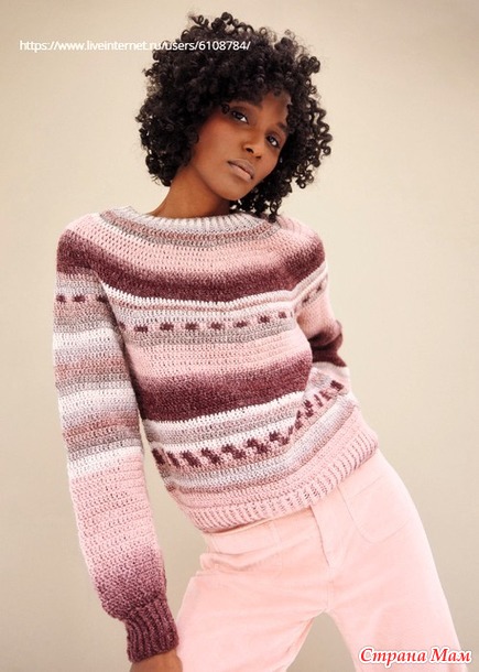 • Техника вязания: Свитер вяжется сверху вниз целиком, комбинируя вязание спицами и крючком.