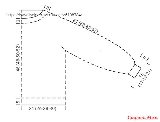 3. Итого на рукаве: 53 (59 - 65 - 71) п. Поставьте маркер в центре подмышки.