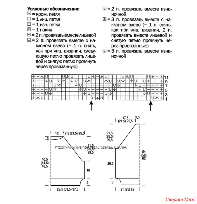 В изн. р. петли провязывать по рисунку, накиды — изнаночными.