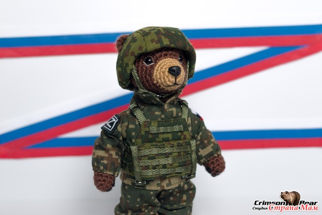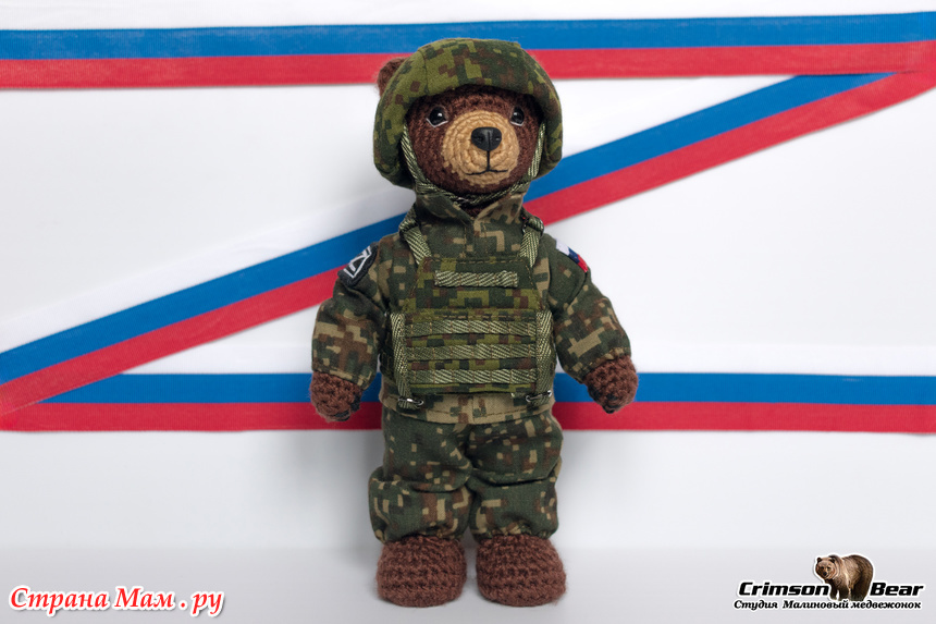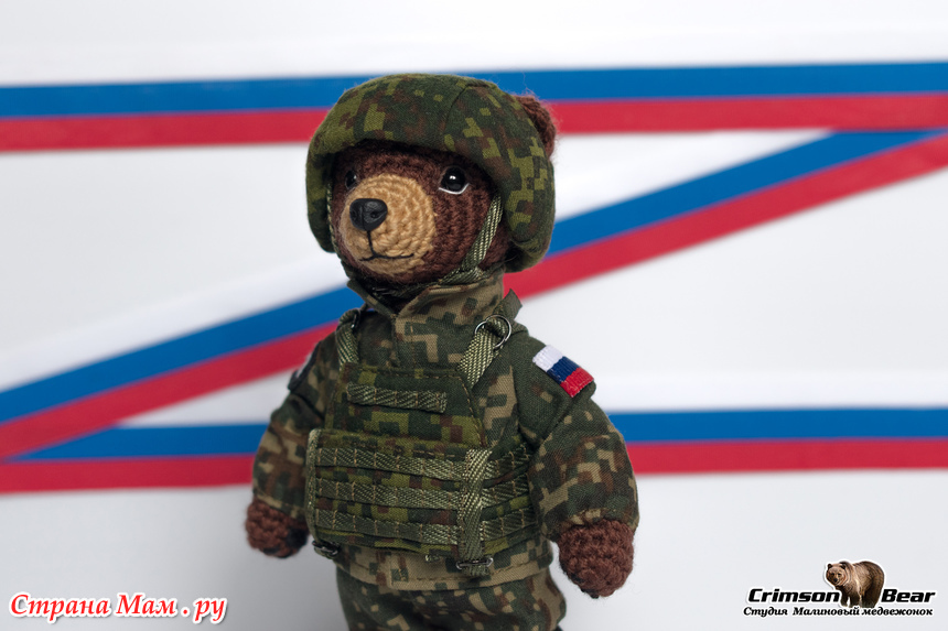 Размер сувенира 15 см. Подвижные лапы на каркасе и голова на шплинтовом креплении. Специальная петелька для подвешивания. Каску и бронежилет можно снимать.